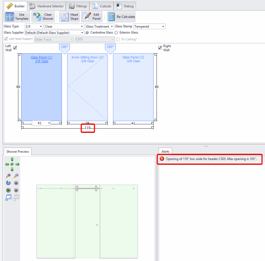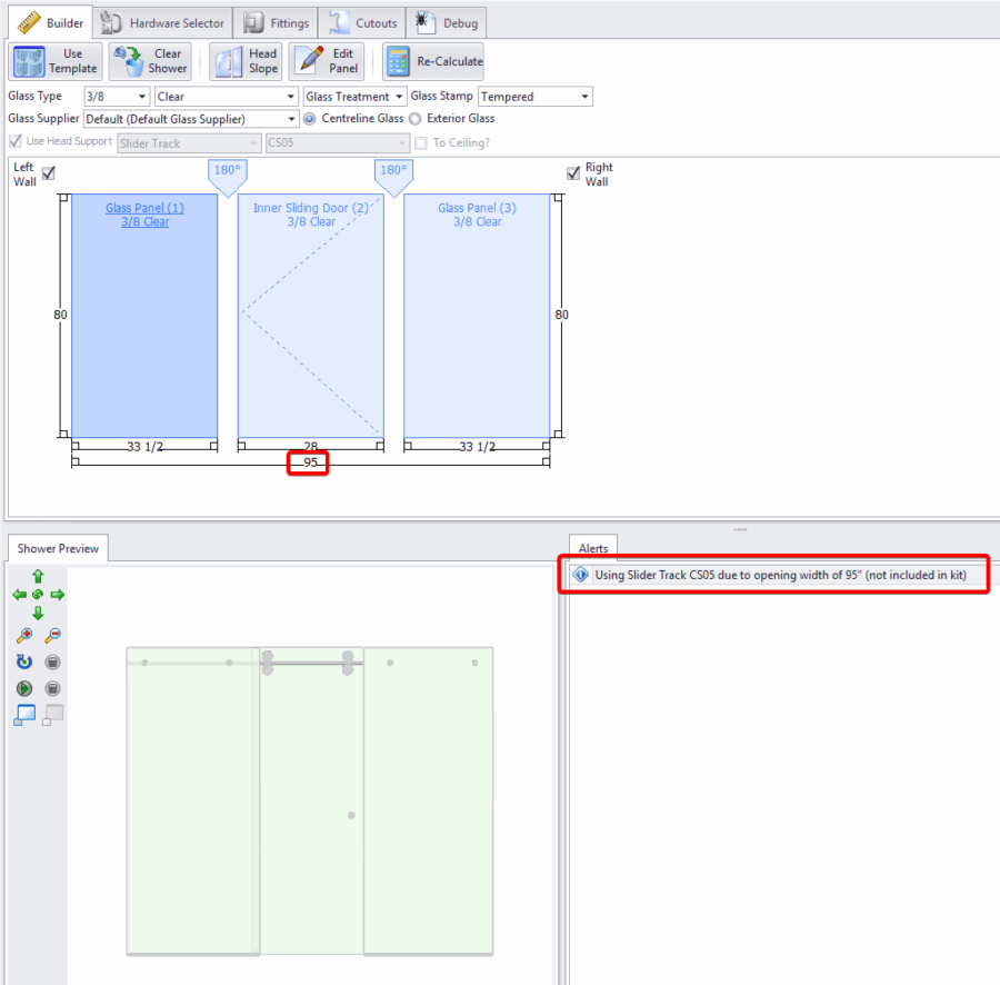 - When the slider opening width exceeds the standard kit header, the correct size will be automatically chosen for the quote along with an info alert message: